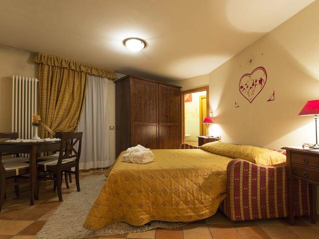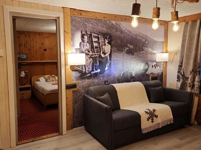 Kaksionen asunto, jossa on yksi makuuhuone, olohuone vuodesohvalla, keittokomero, jossa on 2 keittolevyä, mikroaaltouuni ja astianpesukone.