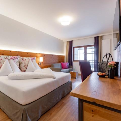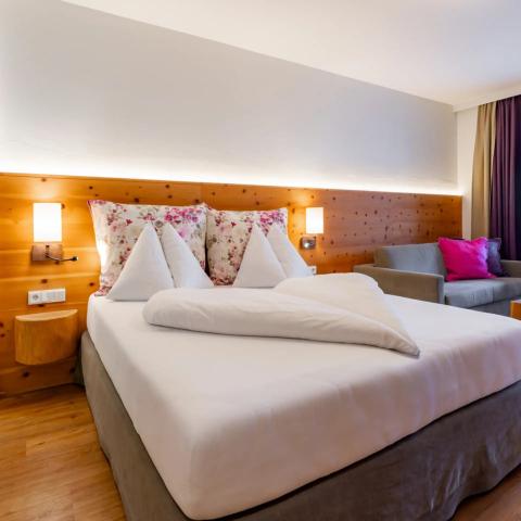 Juniorsviitti, jossa parivuode ja lisävuoteilla, kylpy/suihku, WC ja parveke.
