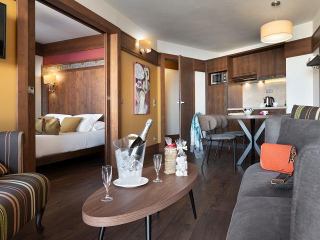 Sviitti 4-5 hengelle, yhdessä tai kahdessa kerroksessa. Kaksi makuuhuonetta, toisessa parivuode ja toisessa kaksi yhden hengen vuodetta, olohuone lisävuoteilla, keittokomero, 2 kylpy/suihku ja WC sekä parveke.
