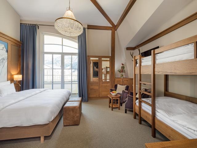 Perhehuone jaettuna kahteen huoneeseen, toisessa parivuode ja toisessa kaksi kerrossänkyä, jossa kylpy/suihku ja WC.